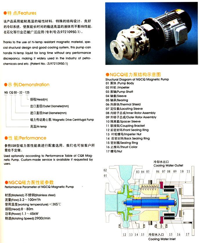 NGCQ型(耐高溫)≤450℃(水冷卻)磁力泵是采用內(nèi)外磁鋼推拉傳遞,磁路中間采用隔離套將液體封閉在隔離套內(nèi),以靜密封取代動(dòng)密封,使泵的過流部件處于密封狀態(tài),解決了其它泵的機(jī)械密封無(wú)法避免的跑、冒、滴之弊病。磁力泵選用耐腐蝕、高強(qiáng)度的工程塑料、鋼玉陶瓷、不銹鋼作為制造材料,因此具有良好的抗腐蝕性能,并可使被輸送介質(zhì)免受染。